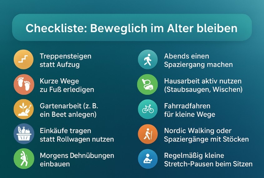 Wichtig ist dabei nicht nur das klassische Training, sondern auch die Bewegung im Alltag: Treppensteigen statt Aufzug, kurze Wege zu Fuß erledigen, Gartenarbeit z.B. ein Beet anlegen oder das Tragen von Einkäufen – all das sind kleine Aktivitäten mit großem Effekt. Wer morgens ein paar Dehnübungen macht oder abends einen kurzen Spaziergang einplant, fördert zusätzlich Beweglichkeit und Wohlbefinden.